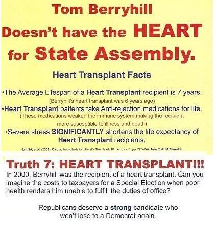 A candidate for State Assembly in the central valley region of CA, Bill Conrad (R) is apparently running on the platform that his opponent won't survive his term because he had a heart transplant.